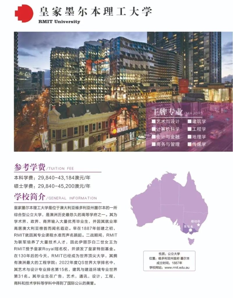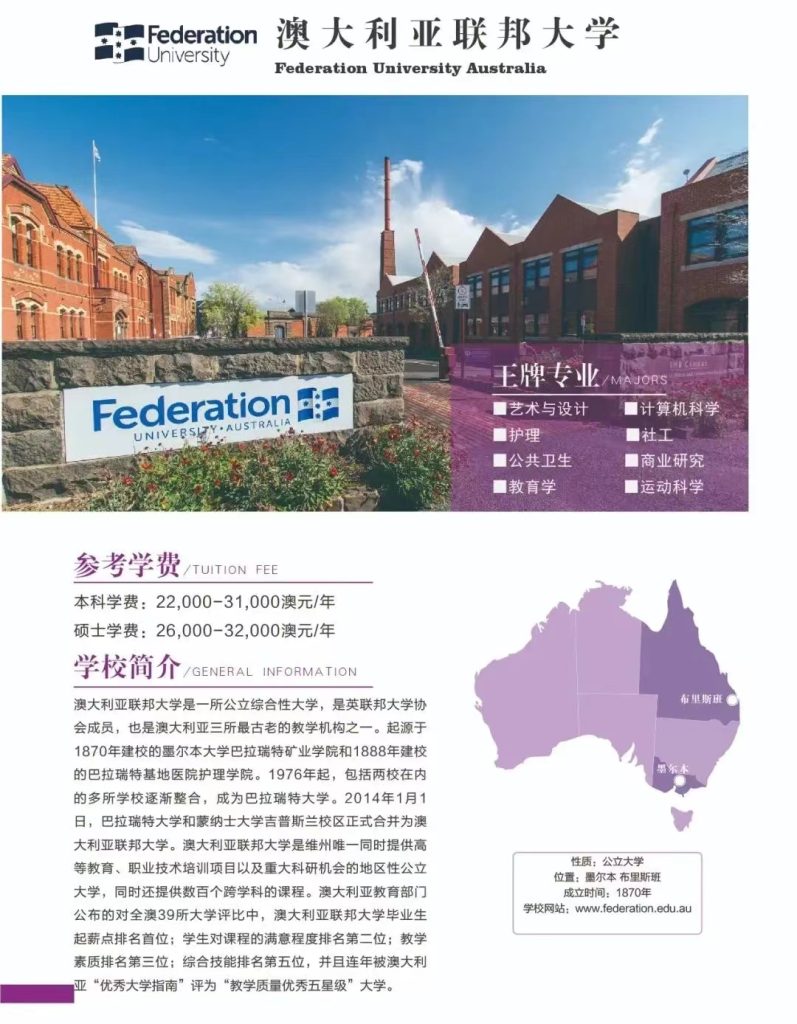 校区:墨尔本,巴拉瑞特校区(Ballarat)和吉普斯兰校区(Gippsland)(这2个校区均可以申请2+2年PSW工签)