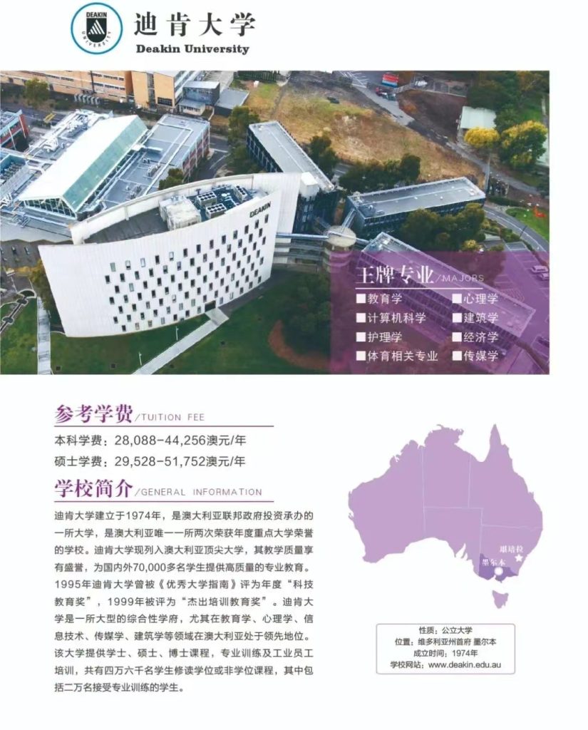 校区:墨尔本伯伍德校区(Burwood),吉朗校区(Geelong)(可以申请2+1年PSW工签),瓦南布尔校区(Warrnambool)(可以申请2+2年PSW工签)