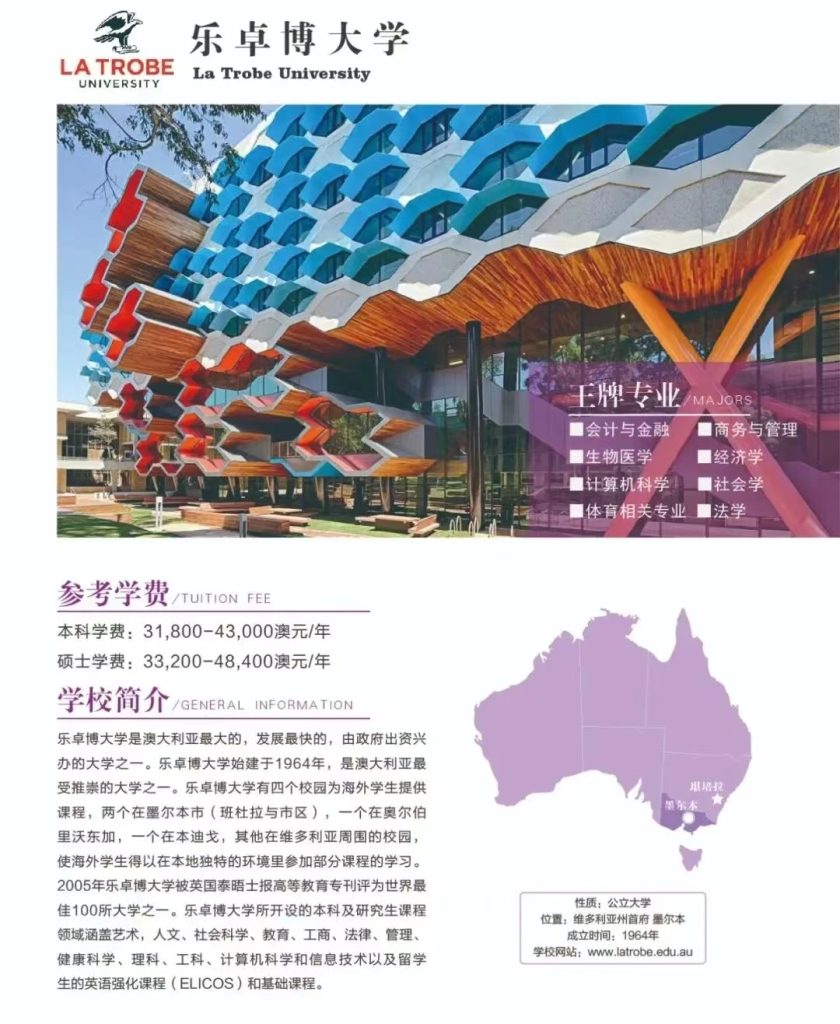 校区:墨尔本本多拉校区(Bundoora),维州阿尔伯里-沃东加校区(Albury Wodonga),本迪戈校区(Bendigo),米杜拉校区(Mildura),谢珀顿校区(Shepparton)(这4个校区均可以申请2+2年PSW工签)