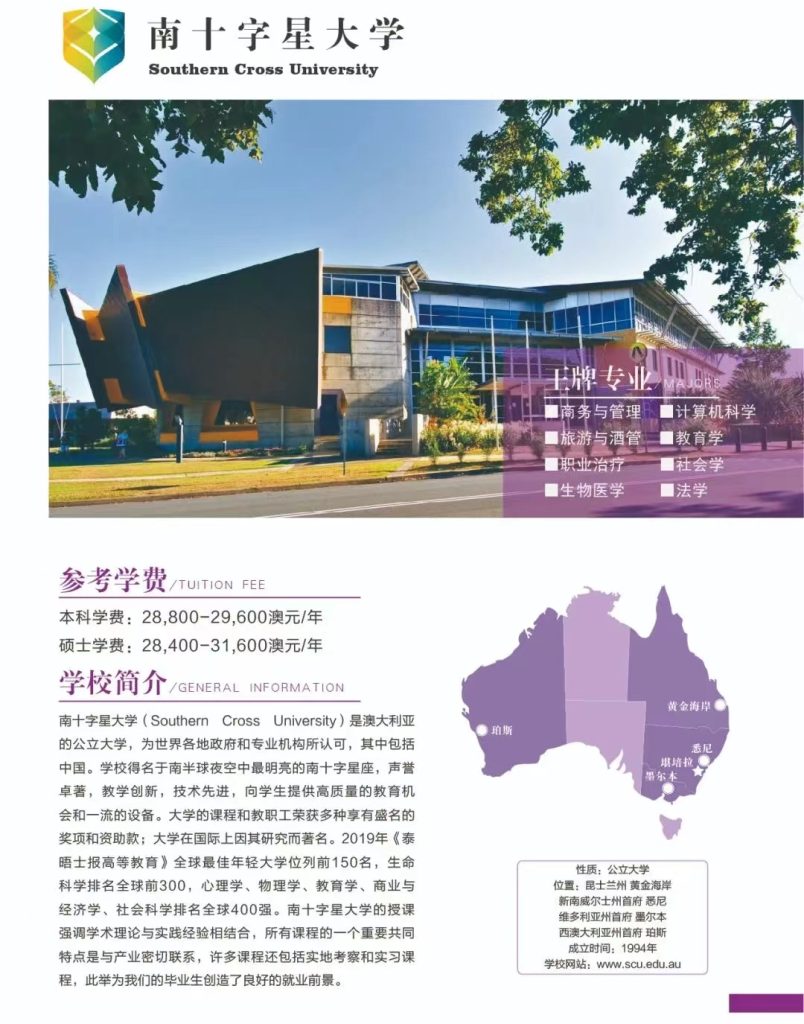 校区:黄金海岸(可以申请2+1年PSW工签),考夫斯港校区(Coffs Harbour)和利斯莫尔校区(Lismore)(这2个校区可以申请2+2年PSW工签)