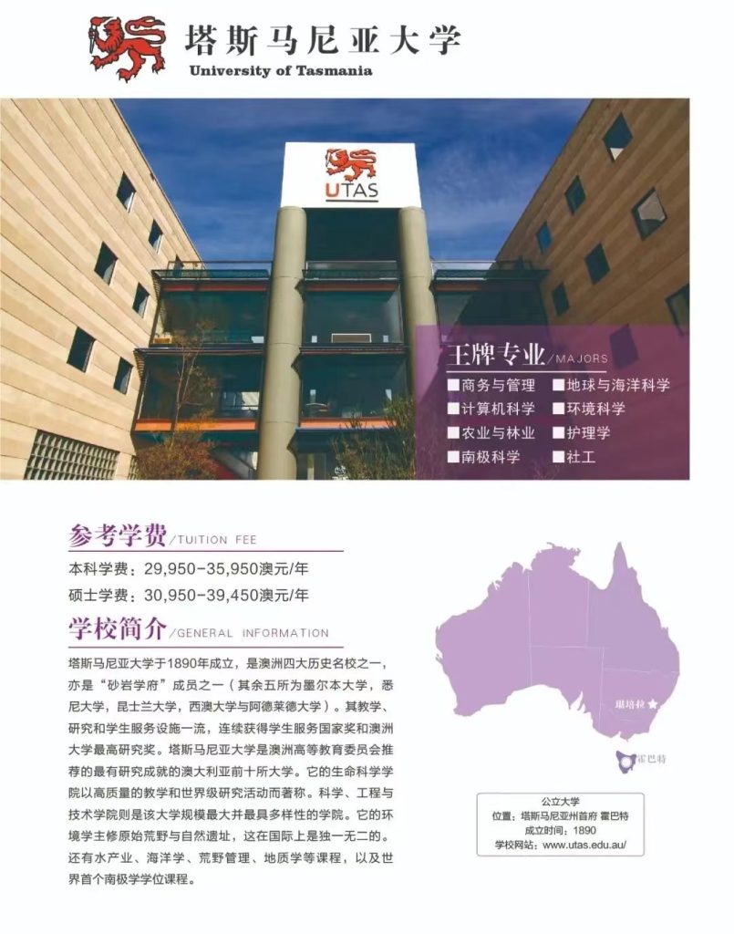 校区:悉尼校区(位于Rozelle区,紧邻Glebe),霍巴特校区(可以申请2+1年PSW工签),朗塞斯顿校区和Cradle Coast校区(均可以申请2+2年PSW工签)