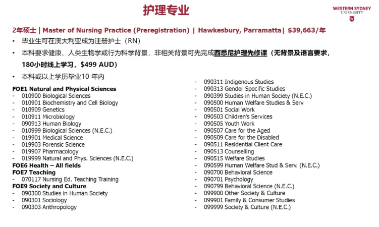 课程详情:2年制,2月开学,$40,200/Y,需要本科或硕士为生物科学,健康或行为科学相关专业或已经是澳洲以外国家的注册护士,如没相关背景,需要修读蒙纳士大学的Human Biology在线课程:https://www.monash.edu/medicine/nursing/study/humanbiology