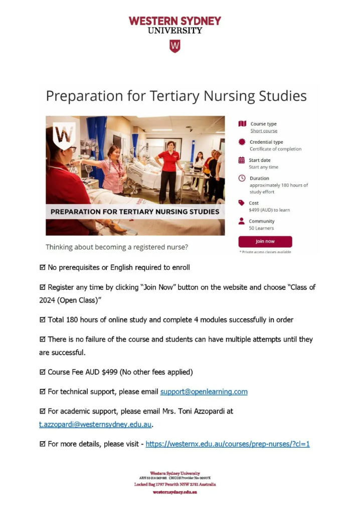 课程详情:2年制,2月开学,$47,000/Y,无本科相关专业要求,雅思4个7或PTE 4个68达标后还需要完成在线Literacy and Numeracy Tests和面试,详见申请指引文档:https://www.sydney.edu.au/content/dam/corporate/documents/faculty-of-medicine-and-health/nursing/mn-2025-admission-guide.pdf