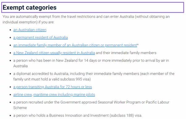除非你是豁免类别或你已经被授予个人豁免目前的旅行限制,否则你不能入境来澳大利亚。