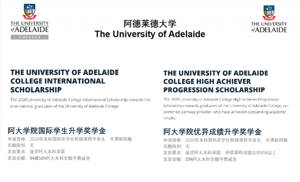 学生在2020年10月31日之前收到并接受阿德莱德大学墨尔本校区Offer,可获$3,000澳元的奖学金。