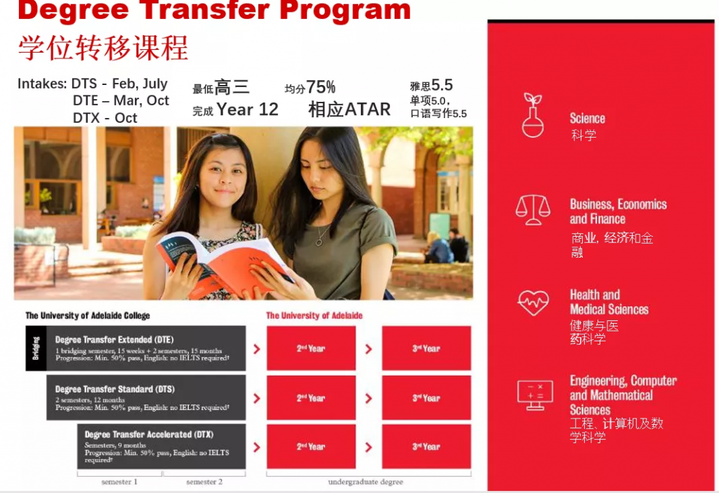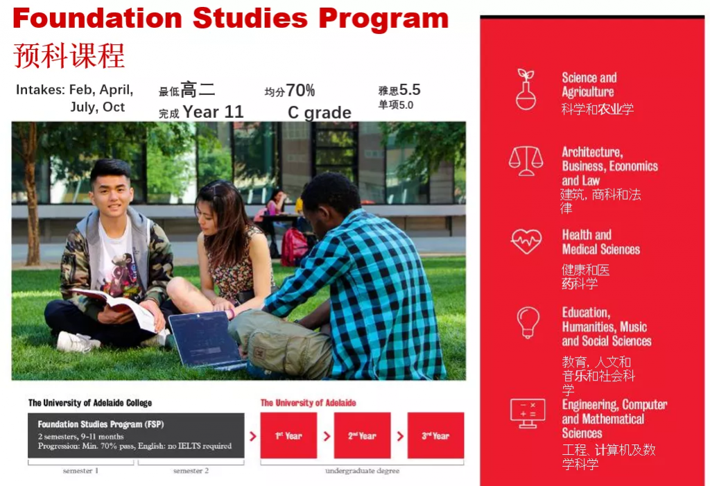 阿德莱德大学学院(The University of Adelaide College)是阿德莱德大学的桥梁课程提供者,为学生提供进入阿德莱德大学深造的学习通道,学生完成学位转移课程(Degree Transfer) 后可直升阿德莱德大学所选专业的本科二年级!