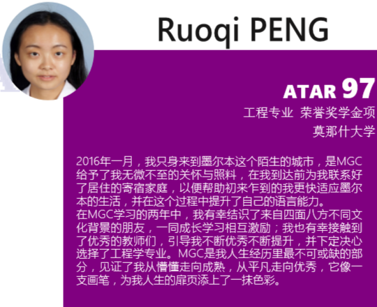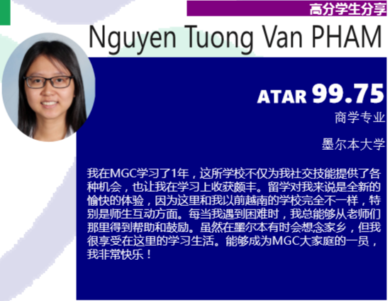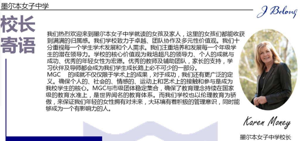 学校出色的学习成绩和精彩的学生领导才能计划,充分体现了“Where Girls Lead and Achieve”的校训。墨尔本女子学院(MGC)结合致力培养个人及社交发展,为学生营造出优质的教育体验。学生在充满安全与关爱的环境中舒心学习。学校鼓励学生发展高水平的成就、领导才能、纪律性和责任感。MGC重视学生群体的多样性,营造充满各种机会的和谐学习氛围,努力培养全球公民。