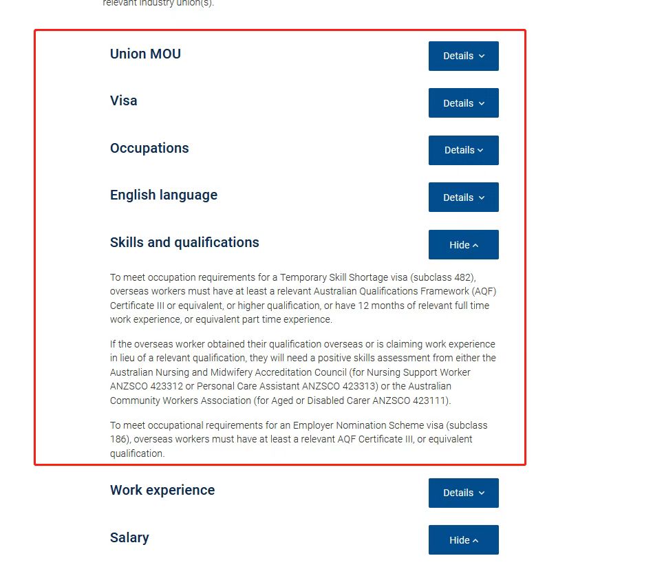 要求确实不高,也确实适合在澳洲持有各种签证类别的,比如说WHV签证或者学生签证持有者,在澳洲就读一个cert 3的老年护理证书也最多只需要半年时间,这样就满足申请要求,下一步就是找雇主申请482雇主担保了,全职2年后转186PR签证。看似过程很丝滑,但是难点也是不少,给大家分析一下。
