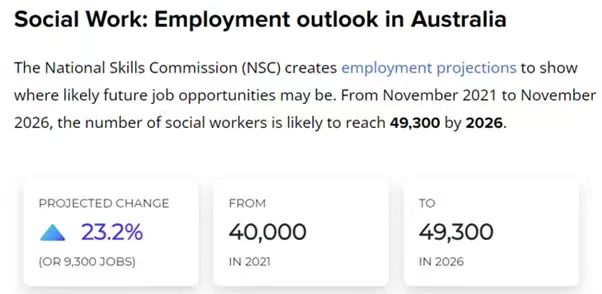 根据澳大利亚国家技能委员会(NSC)未来职业统计报告,预计2026年对社工的需求将会达到49300人,需求率上升23.2%。