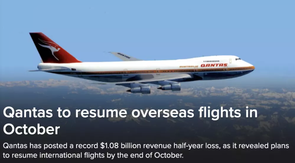 澳航表示,随着澳洲推出新冠疫苗接种,计划于10月31日起重启大部份的国际航线。这家航空公司在疫情发生后损失高达10亿澳元。运载量将较新冠疫症爆发前的水平低,预计要待2024年才会全面恢复。