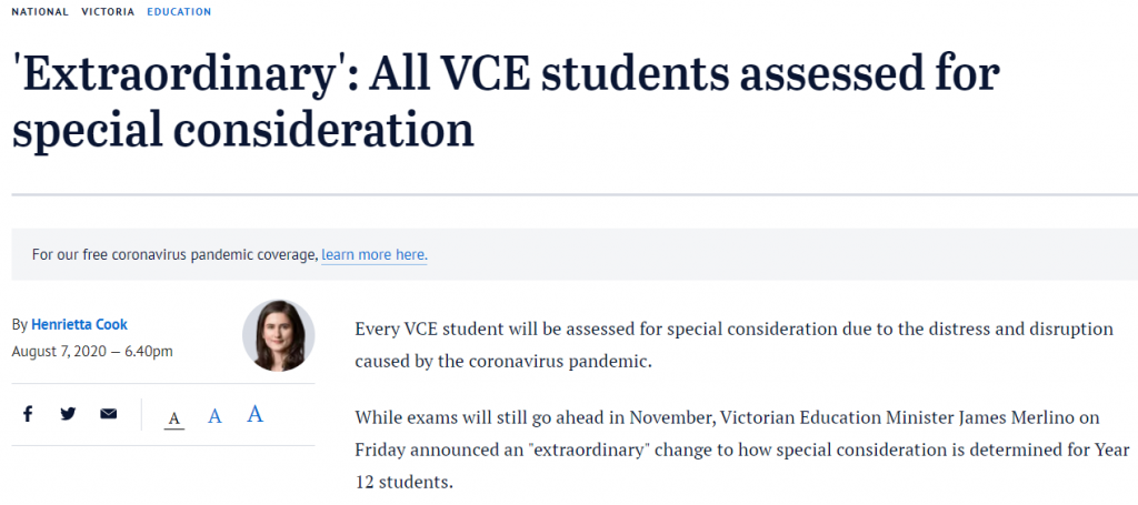 维多利亚大学课程与评估局(VCAA)将引入广泛的“教育劣势考量”程序来计算每个学生的澳大利亚高等教育录取排名,该排名衡量学生与澳大利亚其他应届生的整体学术成就。正常情况下,某些学生会根据具体情况接受特殊评估,但到2020年,维多利亚州的每个学生都将接受这种评估。