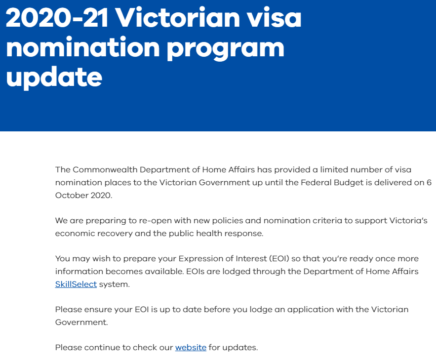 在2020年10月6日联邦预算提交之前,内政部为维多利亚州政府提供了数量有限的签证提名名额。我们正准备重新开放新的政策和提名标准,以支持维多利亚州的经济复苏和公共卫生对策。你可能希望准备好你的EOI,以便你在获得更多信息时做好准备。EOI是通过内政部技能选择系统(SkillSelect system)提交的。在向维多利亚州政府递交申请之前,请确保你的EOI是最新的。原文如下: