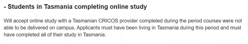 疫情期无法在校内完成课程的学生们,塔州政府接受CRICOS注册的教育机构提供的课程的在线学习。但是,申请人必须在此期间居住在塔斯马尼亚州,并且必须在塔州完成所有网课的学习。