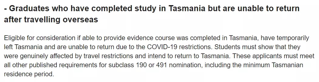 针对疫情期间受旅行禁令影响无法返澳的澳洲留学生们,塔州政府近日对塔州州担保的要求做出了一些适时的灵活调整。本次塔州州担政策调整,主要针对塔州毕业的申请人和在塔州工作的申请人。下面我们将对官网公布的详细政策进行解读。