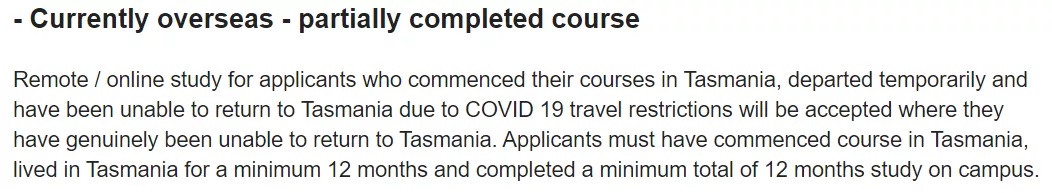 如果申请人已开始塔州课程的远程或在线学习,确实因疫情的影响而无法返回塔州学习的,塔州政府会考虑他们的申请。申请人在疫情前必须已经在塔州开始课程,并且在申请州担保之前,在塔州居住至少12个月,至少完成12个月的在校学习。