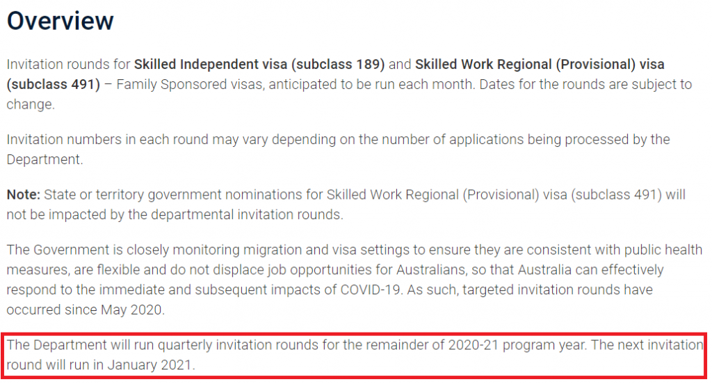 在2020-21财年剩下的时间,189技术移民将由每月邀请改为一个季度(每3个月)邀请。下一轮邀请将于2021年1月开始。从上财年来看,189邀请有针对性地发放医护健康类,本财年邀请范围加入了部分关键职业,工程和IT类职业也有少部分获邀,其他职业均无发放邀请,但EOI获邀的数量仍少之又少!