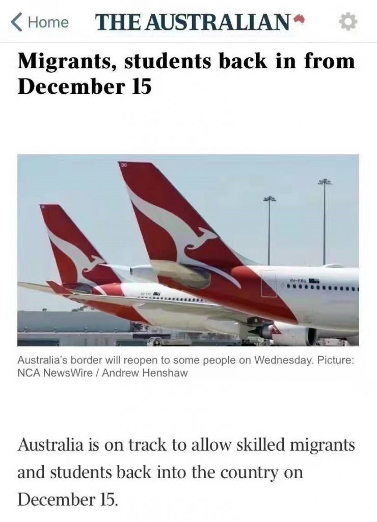 这回是最终的确认!澳洲边境将于12月15日开放!留学生及技术移民等临时签证持有人获准入境,并且确认国境开放不再延期!小伙伴们可以买机票啦!