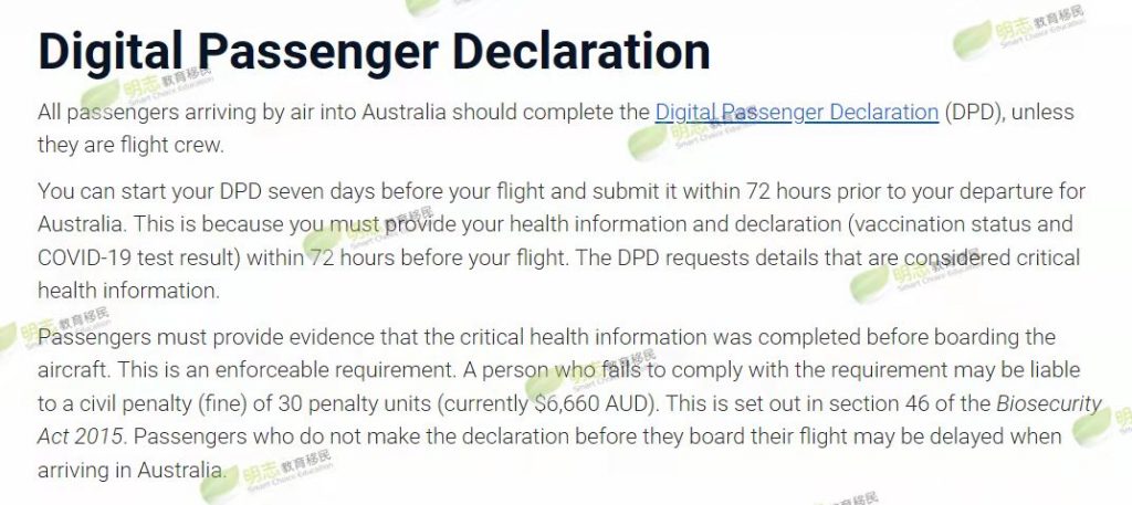 所有乘飞机返回澳洲的乘客必须在航班起飞前72小时内填写Digital Passenger Declaration (DPD),而不是之前的ATD,没有填写DPD的游客将面临最高6,600澳元的罚款。