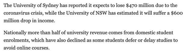 悉尼大学报告称,学校预计将因为新冠危机而损失4.7亿澳元,而UNSW则预计,收入损失在6亿澳元左右。在澳洲,超过一半大学收入来自国际学生,但有些学生为了避免上网课而选择了推迟或取消课程,因此学生数量也有所减少。
