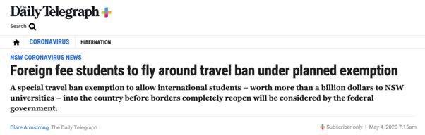 澳洲联邦教育部长Dan Tehan表示:目前海外旅客仍被禁止返澳,政府正在考虑特许留学生优先返澳,借此来增加各大学在疫情期间的收入。这是澳洲政府针对留学生的一项特殊的豁免政策!
