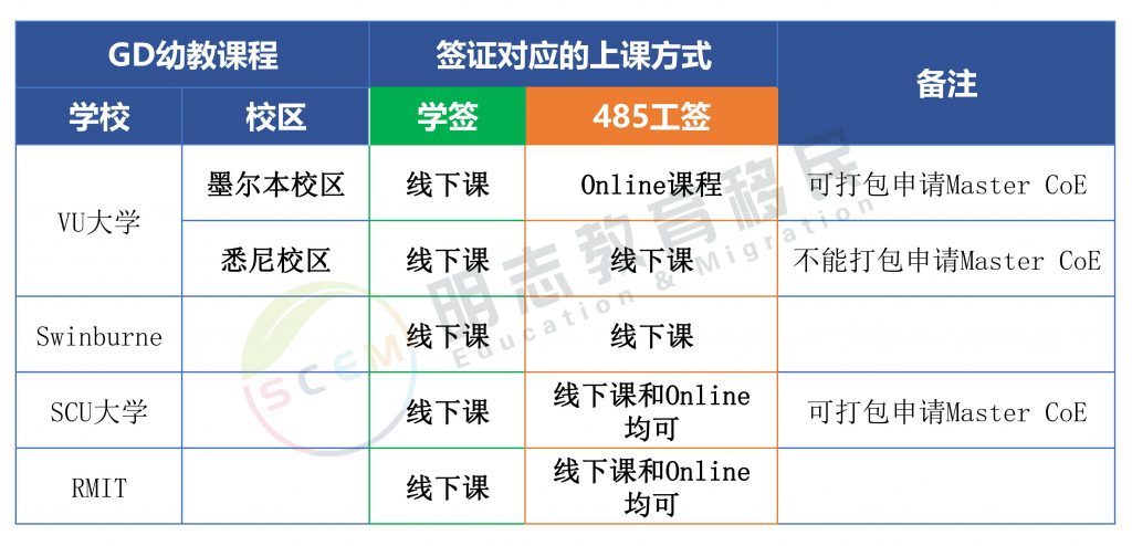 如果是澳本或者澳硕毕业,只想读幼教GD,不想Package维多利亚大学或者SCU剩下1年Master的话,可以先用学签读GD课程,最晚需要再在本科或者研究生毕业内的半年去申请485签证。因为澳本或者澳硕毕业后6个月内不申请485工签的话,就会错过时机,GD不是学位课程,所以不满足之后再申请485工签的要求,除非再加读VU大学剩下1年的Master,等Master毕业后再申请485工签。