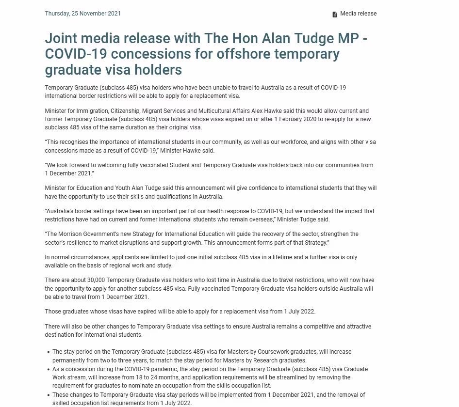 今天(11月25日),澳洲移民部长Alan Tudge在官网发表媒体声明,揭晓485毕业生工签将要迎来的3大巨变‼️