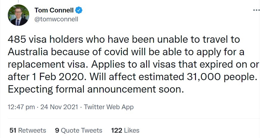 因边境关闭无法入境的485签证持有者们,应该很快会有相应的签证补偿政策啦!大家静候佳音!适用于2020年2月1日或之后到期的所有签证。预计将影响31000人。期待很快正式宣布~