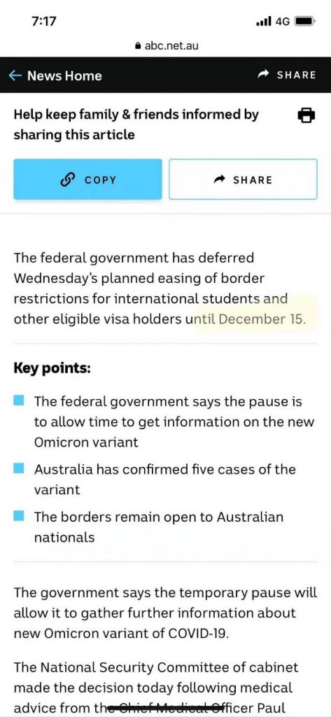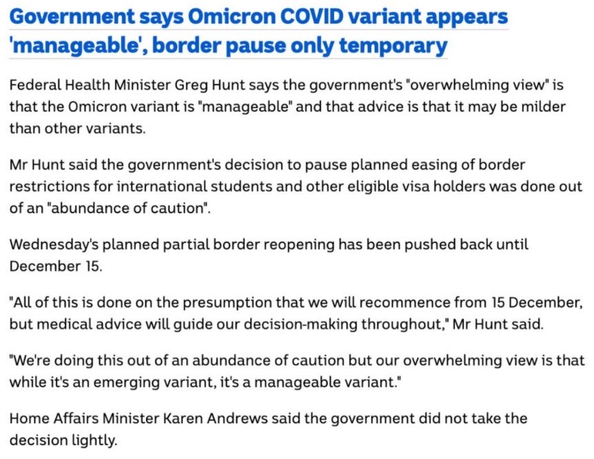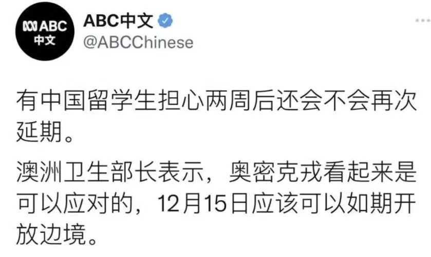 澳洲政府官宣:变种似乎是“可控”的,国境开放暂停只是暂时的!12月15日预计将恢复入境!ABC中文发布推文:澳洲卫生部长表示,12月15日应该可以如期开放边境。